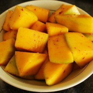 6 Trộn xoài vào hỗn hợp mắm trong khoảng 1h- 1h30 (thỉnh thoảng đảo đều cho xoài thấm)